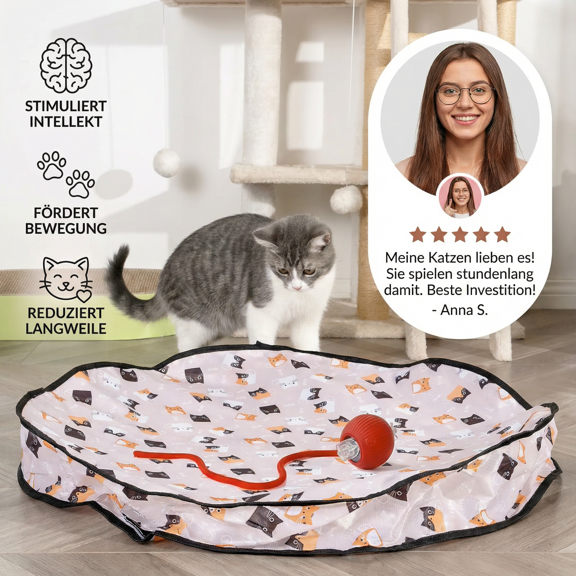 🏃♂️ Sorgt für gesunde Bewegung: Fördert natürliche Aktionen wie Springen, Pfotenhauen und Hinterherjagen und hilft dabei, Langeweile und unerwünschtes Verhalten zu reduzieren.